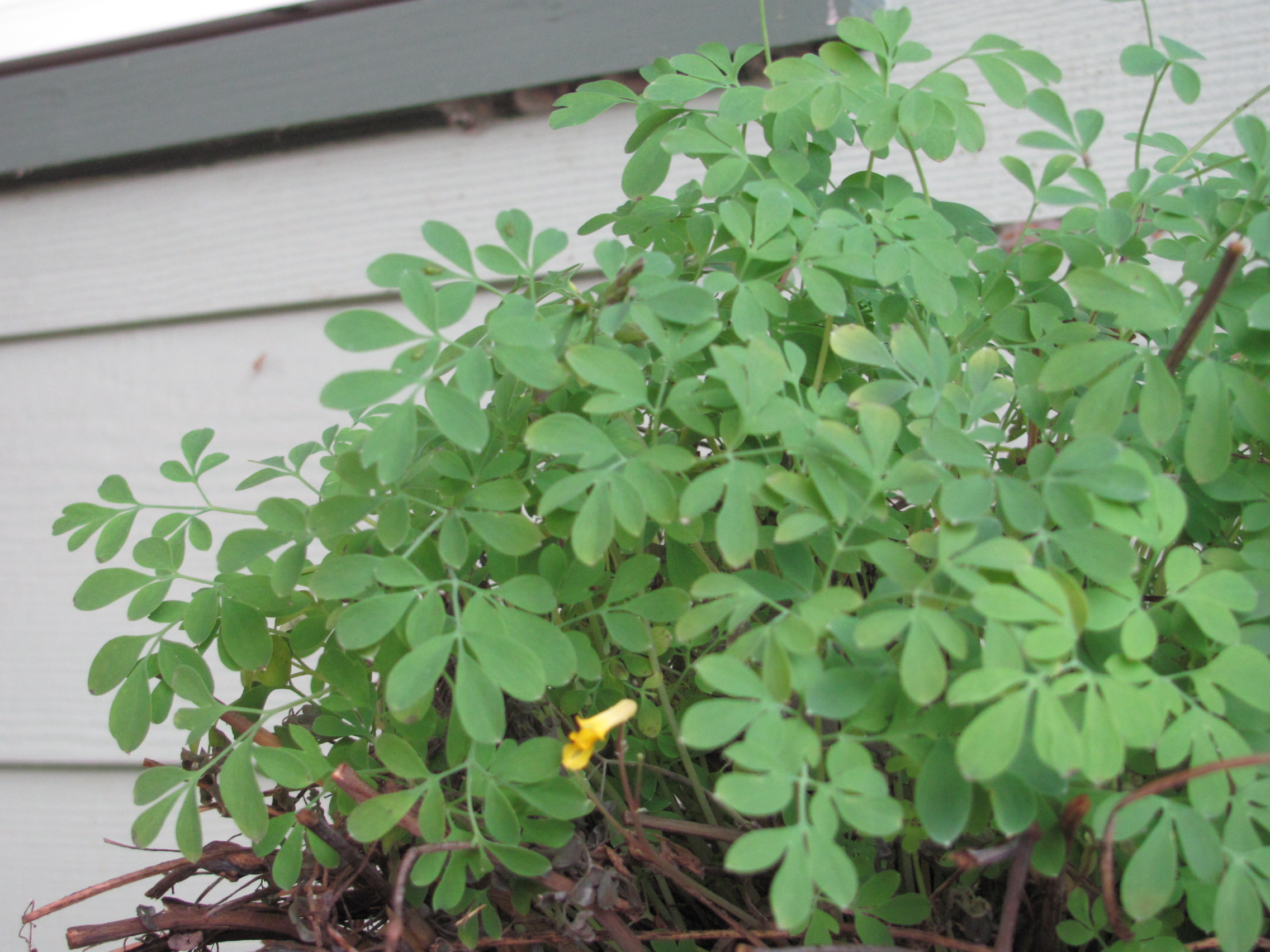 Oh, I so love this shade-loving perennial. I took this picture this morning and even in the depth of January, corydalis has one brave yellow blossom. In the summer it’s just covered with them. I don’t know why the deer have let it alone. They frequently go after a white-blossomed corydalis not three feet away from this one. I’ve heard th