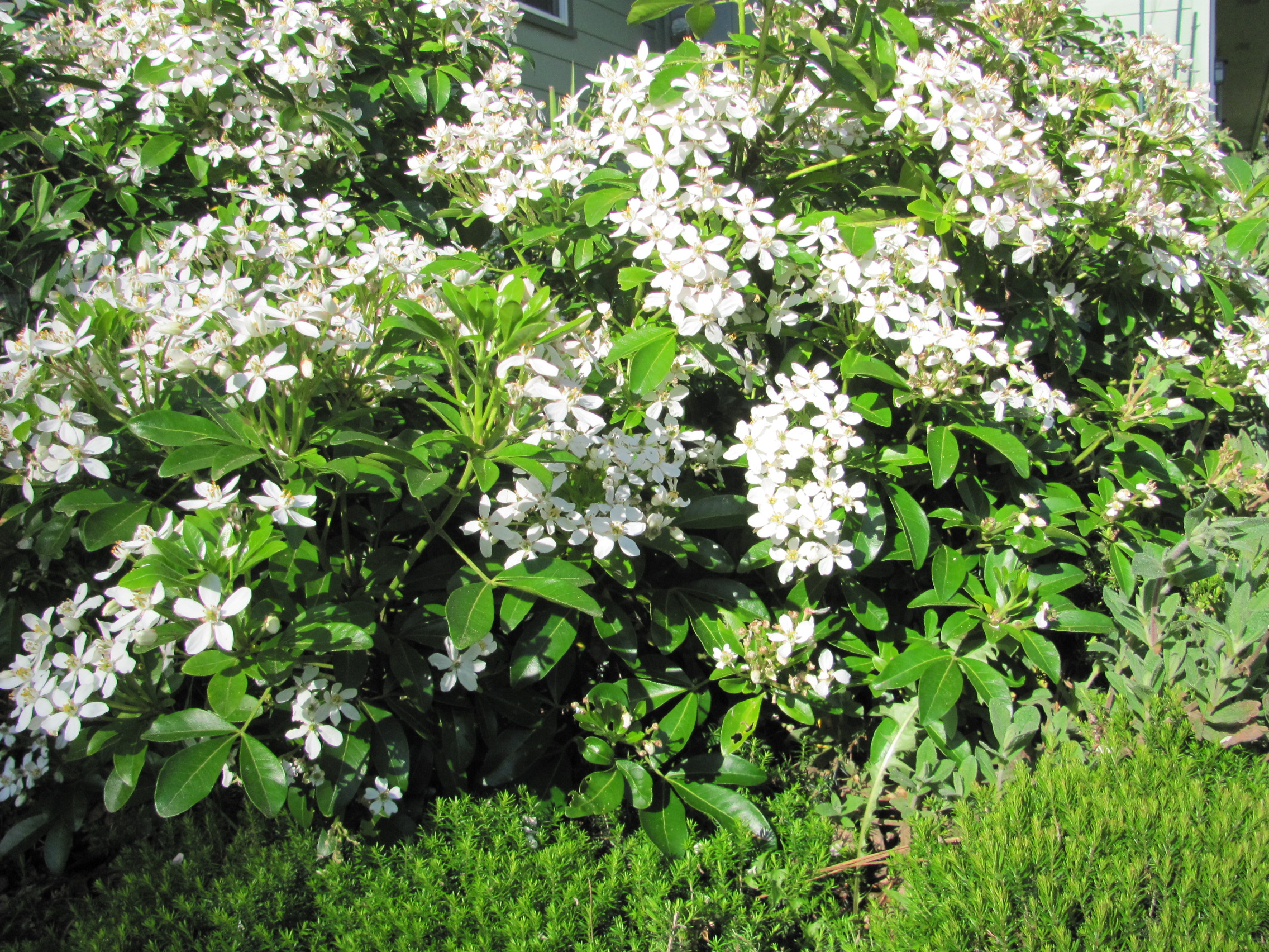 In 2009, my nephew Ethan helped me plant a Mexican orange. It was small and now it’s tripled in size and as you can see is blooming like crazy, the blossoms gently fragrant. There’s heather (which bloomed in the winter) in front and rock rose (which start to bloom in the next month) to one side. I doubt Ethan remembers this event or the visit to our house, because he was just four years old at the time, but I suspect that his grandma Irene remembers. She watched us dig the hole in the rocky soil, knock the plant out of its container, put it in the ground and gently fill in around the roots.