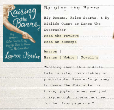 I don’t know why I’ve taken a few years to get around to Lauren Kessler’s excellent book about tackling one of the toughest forms of dance at a time in life when most of us are preferring to sit longer in comfy chairs. But I’ve become enamored with dance myself in the last two years, albeit a much easier kind of dance in the form of Nia. And then last summer I got entirely sucked into an additional more aerobic dance class that kicks my ass but has me smiling the whole damn time. So now it seems I’m at dance class three or four times a week, and maybe that’s why “Raising the Barre” caught my attention.