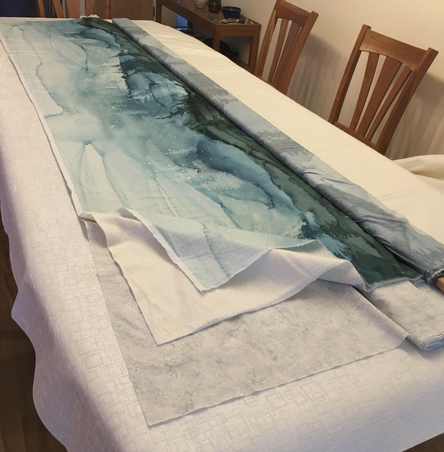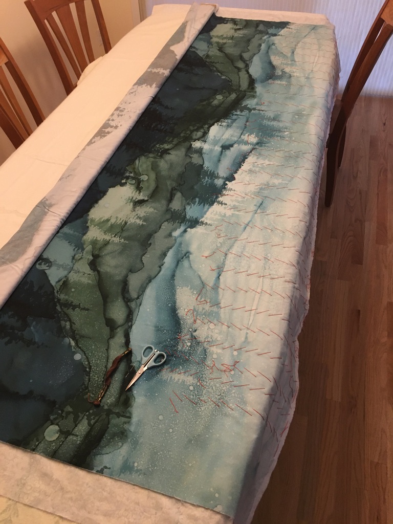 OK. That was last June in Ashland Oregon at Sew Creative. Now here we are in January and I am resolved to start quilting. It’s a single fabric quilt, not something I have to piece together so I can jump right into layering the front and back with the cotton batting middle. Lacking a quilting frame, this is not the easiest task but I found a wonderful quilter, Sharon Schamber whose video tutorial walks you through a clear way to combine the layers and baste them in place. I say “clear,” but do not for a minute think “easy.” It involves wrapping the two pieces of fabric around flat straight 3-inch boards to reduce wrinkling. You slip the cotton between them and then baste in manageable sections.