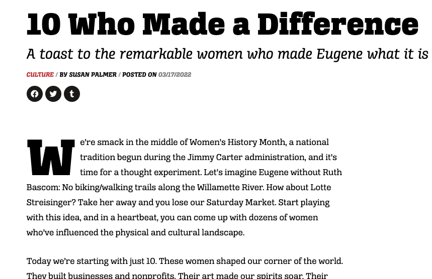A salute to those who make writers’ words come alive on paper. I’ve had the great privilege of working with award-winning page designers at various newspapers over the years, and they can make or break a reader’s first impression. My most recent project, a tribute to local women, has two completely different looks. The photo at left shows the printed page. The one below shows the electronic edition. Two completely different fonts and layouts. This is talented Todd Cooper’s work. I am delighted with both efforts. I bring this up because I know many writers these days self publish and I would advise not skimping on layout. Good page designers are worth the investment.