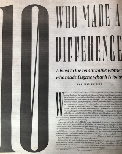 A salute to those who make writers’ words come alive on paper. I’ve had the great privilege of working with award-winning page designers at various newspapers over the years, and they can make or break a reader’s first impression. My most recent project, a tribute to local women, has two completely different looks. The photo at left shows the printed page. The one below shows the electronic edition. Two completely different fonts and layouts. This is talented Todd Cooper’s work. I am delighted with both efforts. I bring this up because I know many writers these days self publish and I would advise not skimping on layout. Good page designers are worth the investment.