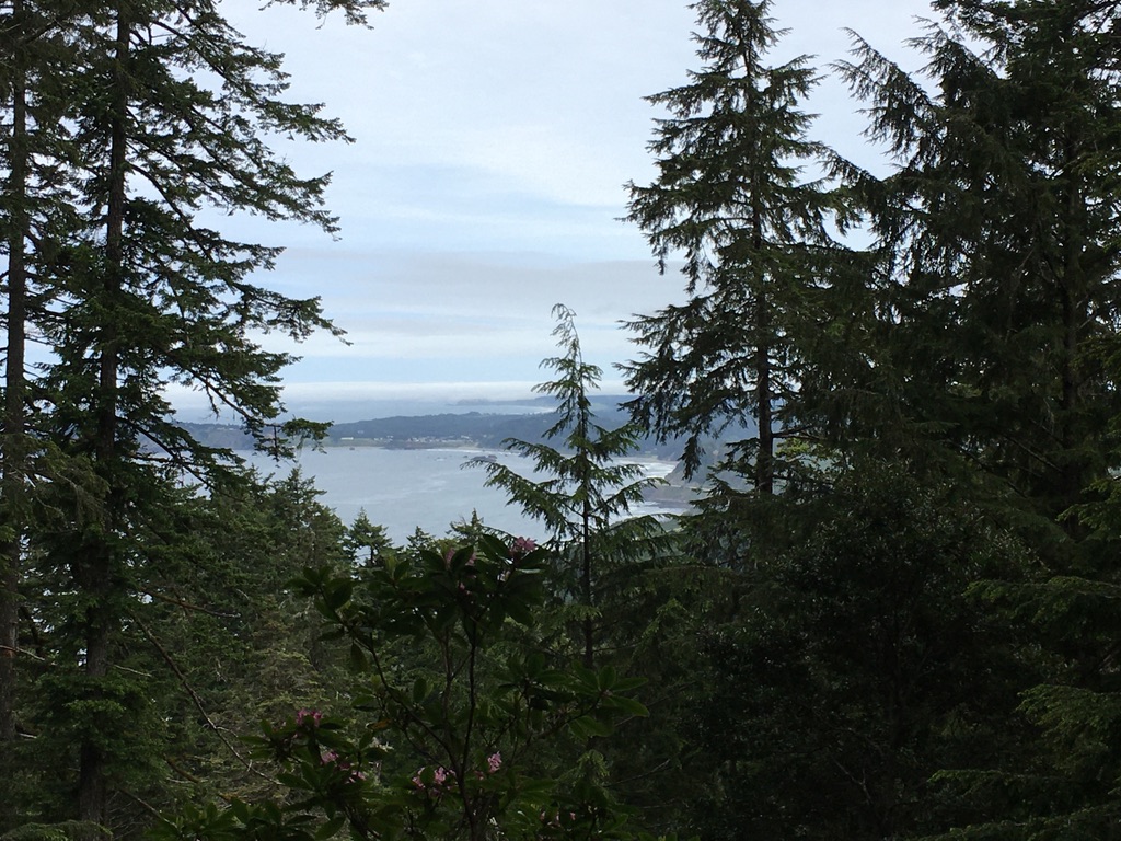 Last month Craig and I camped and hiked at Humbug Mountain State Park, which, though close to the highway, has a secluded feeling. A fine trail winds through big trees to the top of the mountain and while its elevation gain is 1,700 feet over three miles, the switchbacks make it seem less arduous than I’d expected. We hiked at the right time for flowers: wild iris, rose, rhododendrons, bleeding hearts, and many others I have no names for.