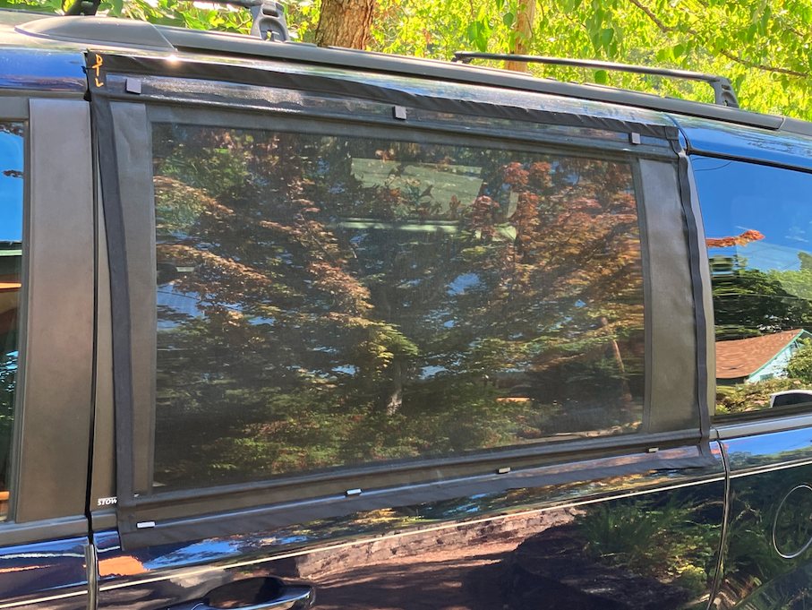 I bought new screens, cut them to size, sewed bias tape around the edges to keep the mesh from fraying and then sewed in small wood dowels that sit in the door grooves and hold the screens in place. Magnets, not the rare-earth kind — hold the whole thing against the car. I keep them separately in a small bag. The screens wrap up neatly around the dowels when not in use. Deploying and storing just got simple.