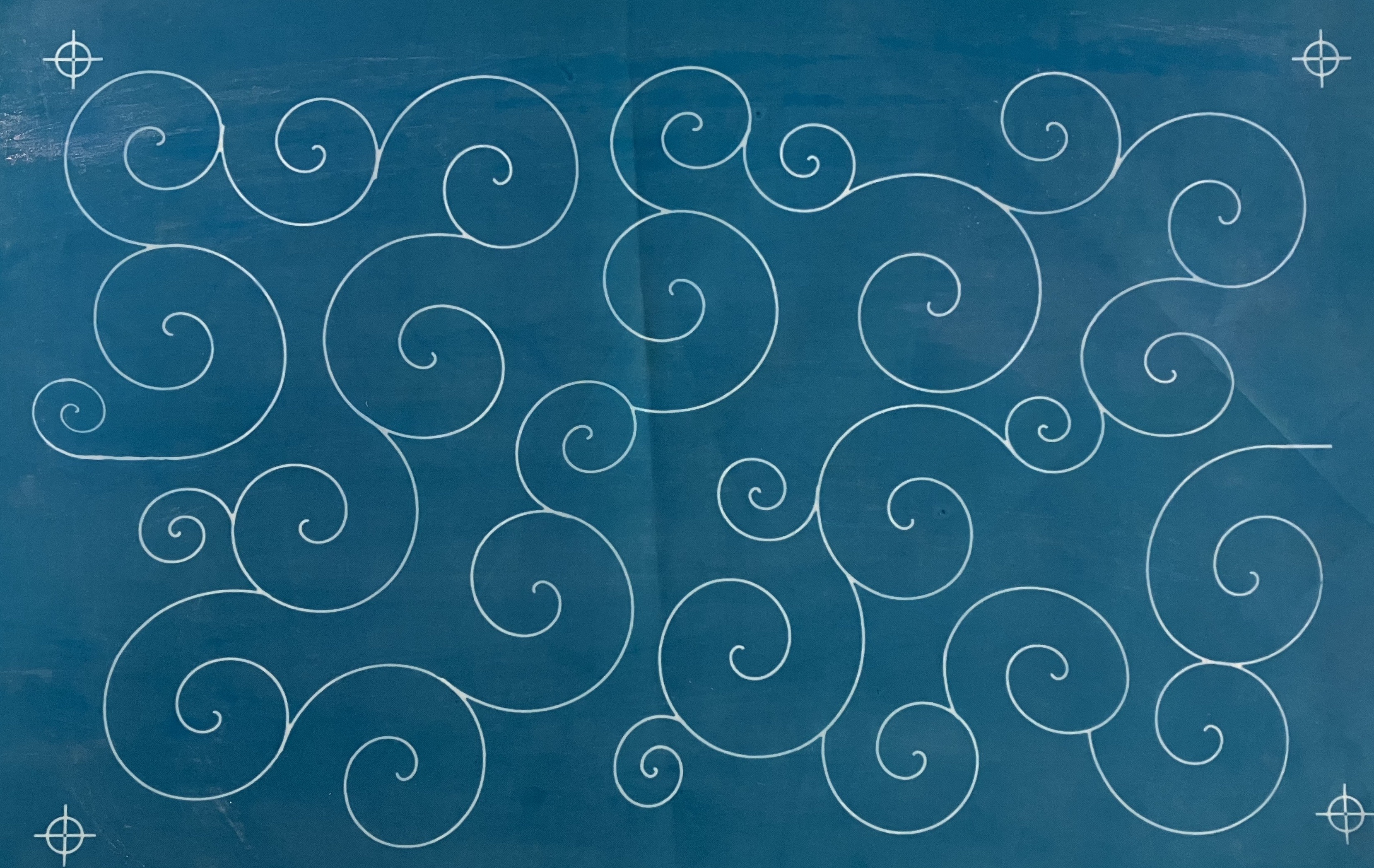 This stencil, about 8 inches by 14 inches, repeats over the queen-sized quilt I’ve been working on since January. It takes me about three hours to stitch one of these panels.