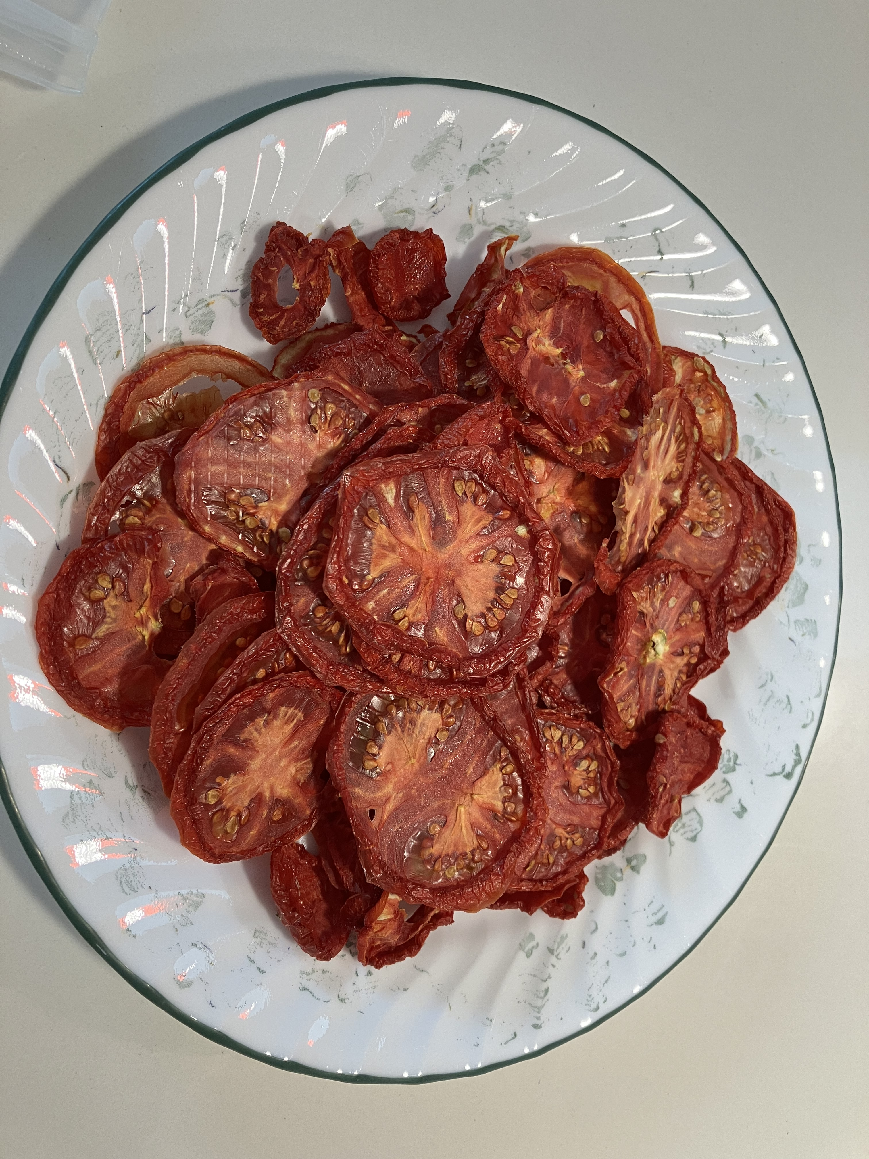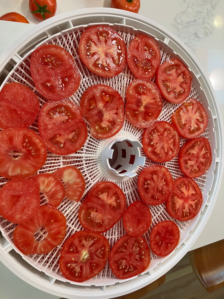 When you get a dozen or so ripe tomatoes from the garden every day, dehydrating them into crispy sweetness is just too easy (after all the tomato sandwiches and fresh salsas, etc., have been indulged in). A note about food safety: We freeze the dried tomatoes to avoid concerns about not getting every last bit of moisture out of them. They hold up well in the freezer for well over a year. Many state university extension offices also have great recommendations for preserving fresh tomatoes.