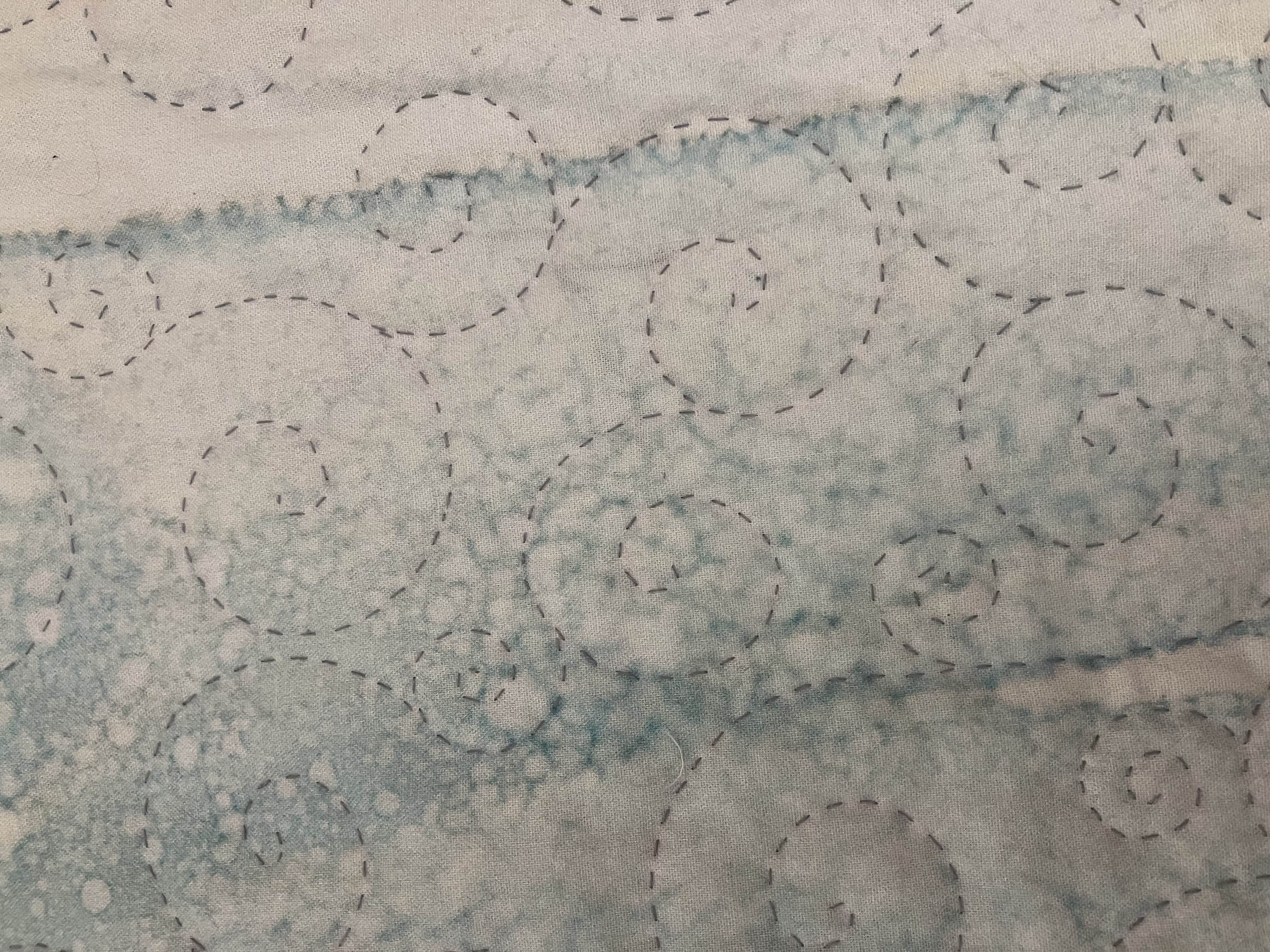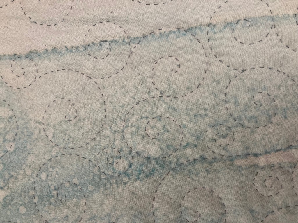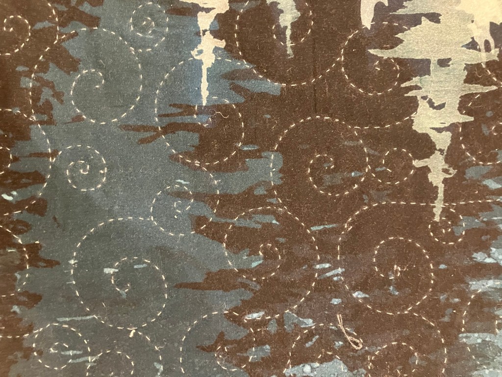 I counted the stitches in an 8″ x 14″ section of the quilt to extrapolate the total stitches and that came out to 71,364. It took me roughly an hour to do about 350 stitches. That’s 198 hours of sewing.