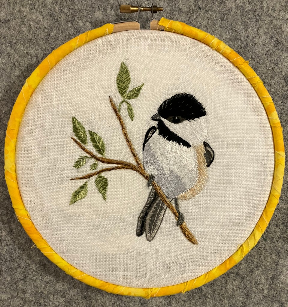 Hand embroiderers call this thread painting. I’ve been playing around with it for a couple of years. While I’ve done some experimenting with my own designs, there are some amazing embroiderers out there who sell designs, even kits including fabric and thread. I’ve done a few of those and quite enjoyed them, but there’s a kind of paint-by-numbers feeling to them, so this year I’ll play with my own designs. This is my first project of 2023 (begun in December). I started by looking at many photos of chickadees and a particular image of the bird, body facing the camera but head turned, caught my eye.