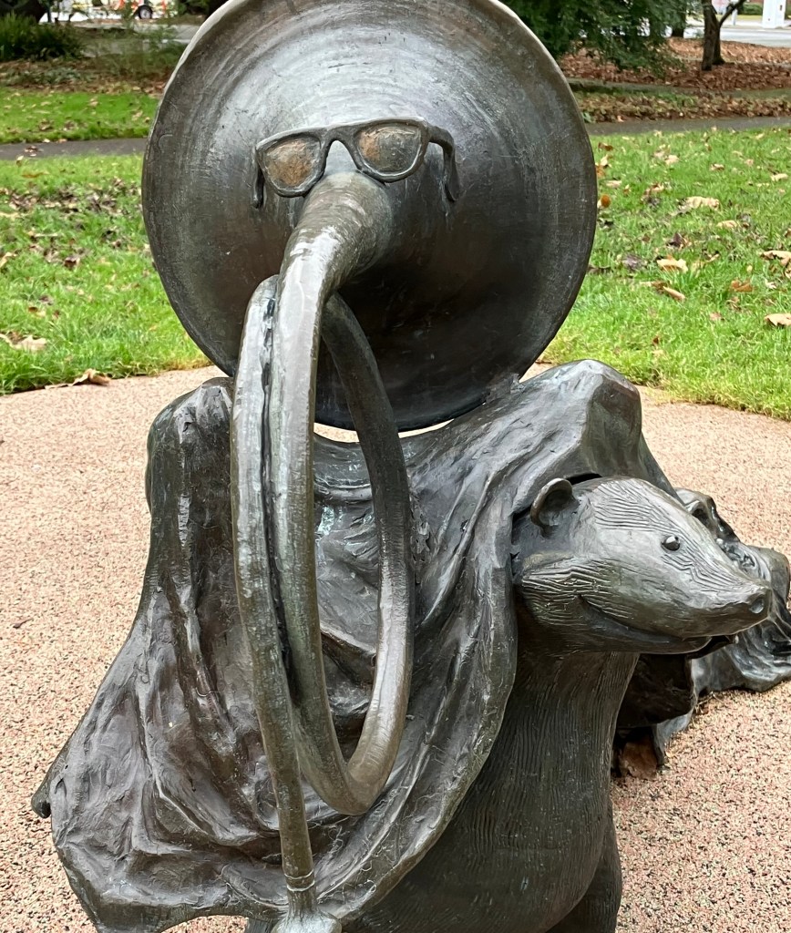 Sculptor Peter Helzer‘s Parade of Animals at the state capitol in Salem surprised and pleased me when we walked by on a visit with family last month. I had seen pictures but hadn’t been in its presence.