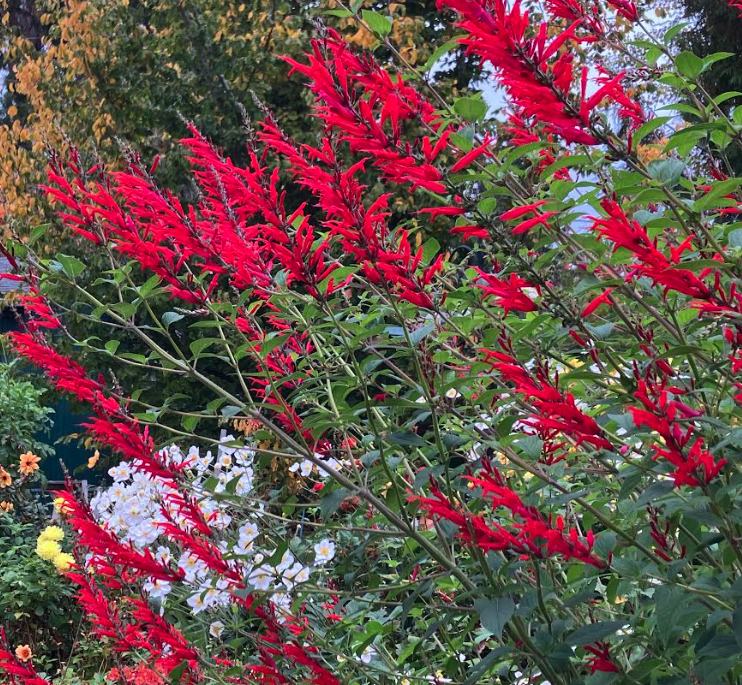 Pineapple sage (salvia elegans) is a perennial (in Oregon) and part of the mint family. It doesn’t start blooming in my garden until mid September. Then it kind of loses its mind with these spikes of brilliant red. The neighborhood hummingbirds love it.