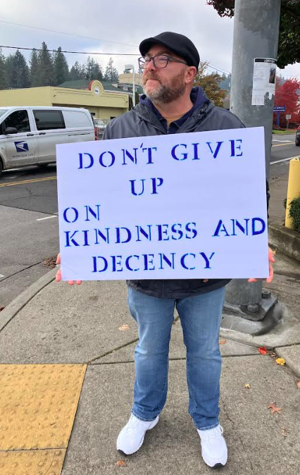 Today I’m grateful for a fully functioning body and for my love of moving to music. I’m grateful for a guy named Brent with a sign about kindness and decency. And I’m grateful for a loving spouse to stand with as winter approaches.