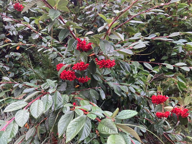 On our morning walk, Craig and I passed this cotoneaster, its red berries the brightest thing around on an otherwise rainy low-cloud-ceiling day. It buoyed my spirits which had been busy with gloom-of-winter thoughts.