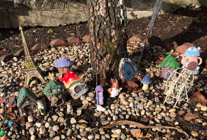 Literally and figuratively. Here in Eugene, OR, Friendly Street runs through a neighborhood of ordinary homes, a few fancied up, but many still modest. It’s known as the Friendly neighborhood and I love living here. It’s walkable, with parks and churches and schools and a small grocery and decent restaurants and no homeowners association policing home and yard appearance. People walk by and tell you how nice your yard looks, or ask about your kids, or notice your dog being well behaved. They set out extra produce from vegetable gardens or extra bulbs from flowering plants to share. (We do have our curmudgeons, but everyone is a curmudgeon sometime.) Among the gardens — perfect or tidy or messy or disastrous — there is a fine dose of whimsy. Here’s just one example from our morning walk. I love that I never know what I’m going to see.