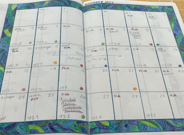 This is easy for me because I maintain a “got done” calendar. It may be counter-intuitive — most people prefer to-do lists — but it helps me settle the dragon, the beast in my brain that is never satisfied. When the dragon’s breathing fire, I can go to my “got done” calendar where I record progress on writing projects, days on which news stories I’ve written have been published, weight loss (and weight gain), days I danced Nia, travel days. I draw this calendar myself in a pink soft-bound notebook with a crow on the cover (to remind me to be curious). It reminds me to celebrate successes, even small ones such as “I wrote four paragraphs” on a day in which writing anything seemed impossible before it was in my rear view mirror.