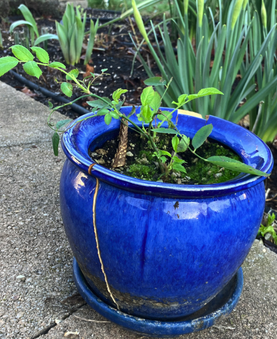 It grew roots and added leaves and in about two months, I had a viable little rose start. I put it in this blue pot, set it out on the deck, then forgot about it and it nearly died from lack of watering. But didn’t quite die. I cut off all the withered parts and it grew up again.