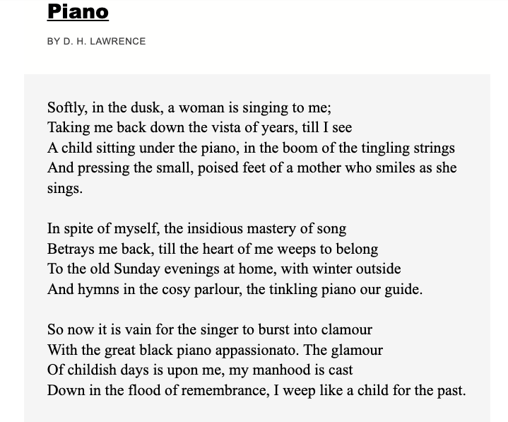 For that, The Poetry Foundation provides an easy option: Their emailed daily newsletter delivers a poem. These poems can be contemporary or classic and they choose from a global list of poets. Today, they offered an emotionally rich poem from British author D.H. Lawrence. Lawrence holds a place in my heart because he wrote about sexual intimacy in a way that doesn’t feel salacious to me. (Lady Chatterly’s Lover).