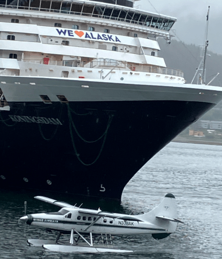 I took the above left picture from The Hanger on the Wharf, a lively bar overlooking Gastineau Channel, which is where the massive ships disgorge their passengers and also where the city’s seaplanes land and take off. What an unexpected dance, to see the cruise ships and seaplanes moving efficiently yet so close to each other.