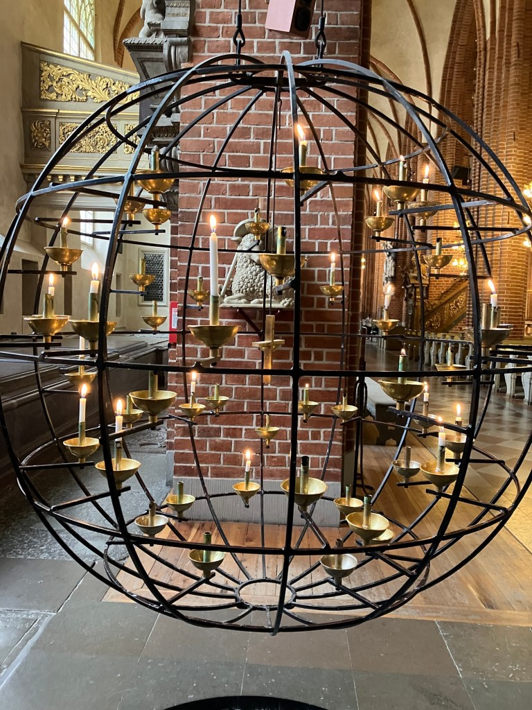 A new thing in an old church: The Stockholm Cathedral —Storkyrkan — was built sometime before 1279, 746 years ago. Aside from being amazed at the age of the structure and its grace of design, I loved a relatively recent addition, the Candle Globe, a metal globe with small candle holders around and through it. Added to the church in 1972, it’s a place to light a candle to the world, to ponder and possibly pray about whatever the art evokes. The work was created by artist Torolf Engstrom.