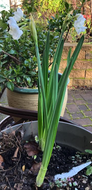 Or should I say gardening with a squirrel assist. I’m not the biggest fan of paper whites. Would never buy the bulbs despite their early winter bloom schedule. But apparently the local squirrels thought I ought to have some. About two months ago the pots on my patio had that disturbed look, a depression, with bits of soil splattered around outside them. I figured either the crows had dug around for some yummy grublike thing or squirrels had left a nut or two.
