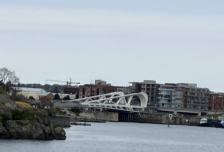 I really wanted to see the Johnson Street Bridge spanning Victoria Harbor raised. A massive steel thing going up in the air, smooth as thought. It’s saying “come on in” to the big boats, the tall-masted sailboats, the working tugs, the industrial, the commercial, the research vessels, sliding past at the harbor’s narrowest point.