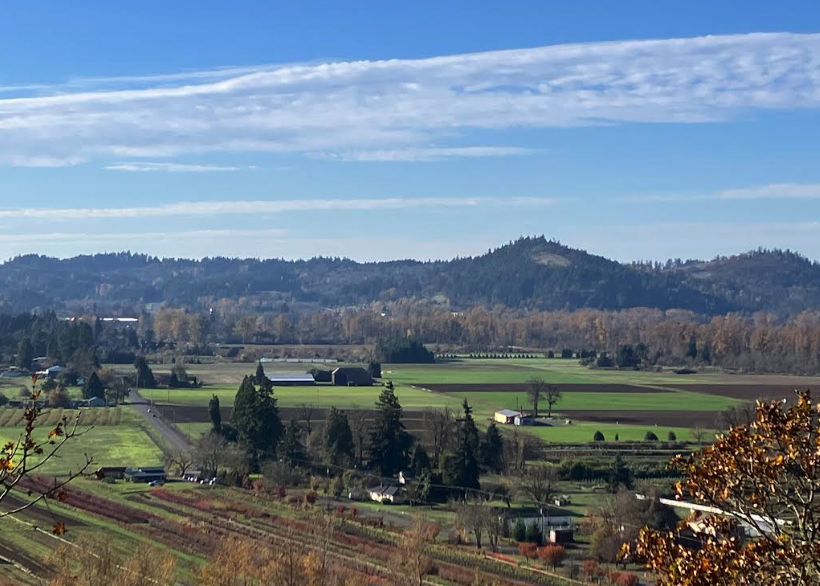 This is such a sweet view of the southern Willamette Valley, and just a 20-minute drive and 10-minute walk to get there, there being a hiking trail that winds to the top of Mount Pisgah (actually more of a hill). Going to the top reveals the sweep of the Cascade Mountains, but I’m partial lately to the farmland that hugs the Coast Fork of the Willamette River on the edge of our fair city.